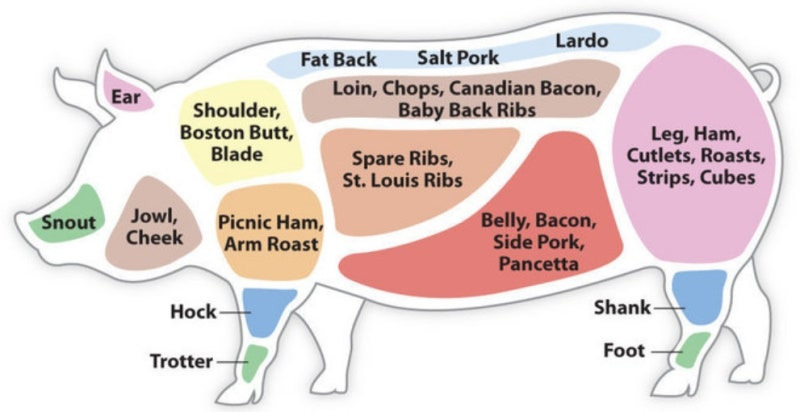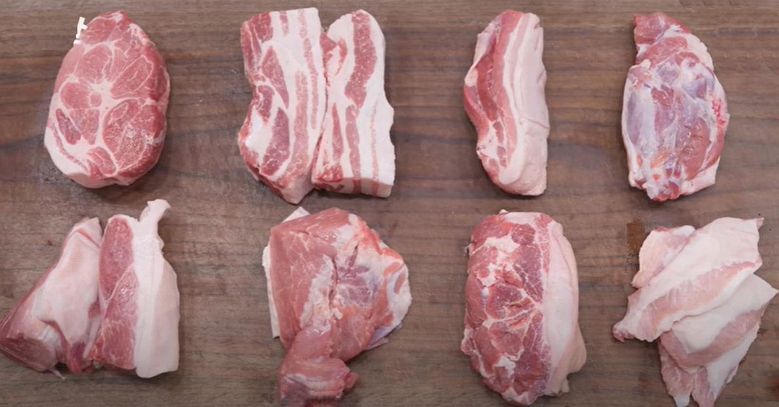 목살, 삼겹살, 오겹살, 아롱사태, 앞다리살, 뒷다리살, 덜미살, 두항정