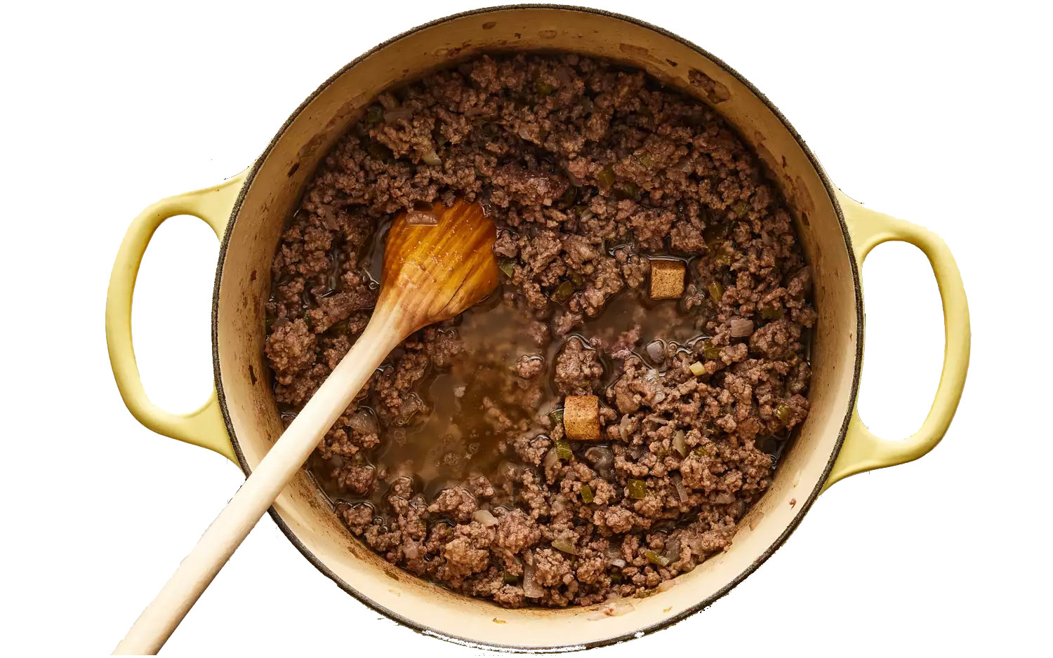 - 소고기 육수 큐브 1개를 뜨거운 물 300ml에 넣고 잘게 부수어 녹인 후 다진 소고기가 들어 있는 팬에 붓는다.