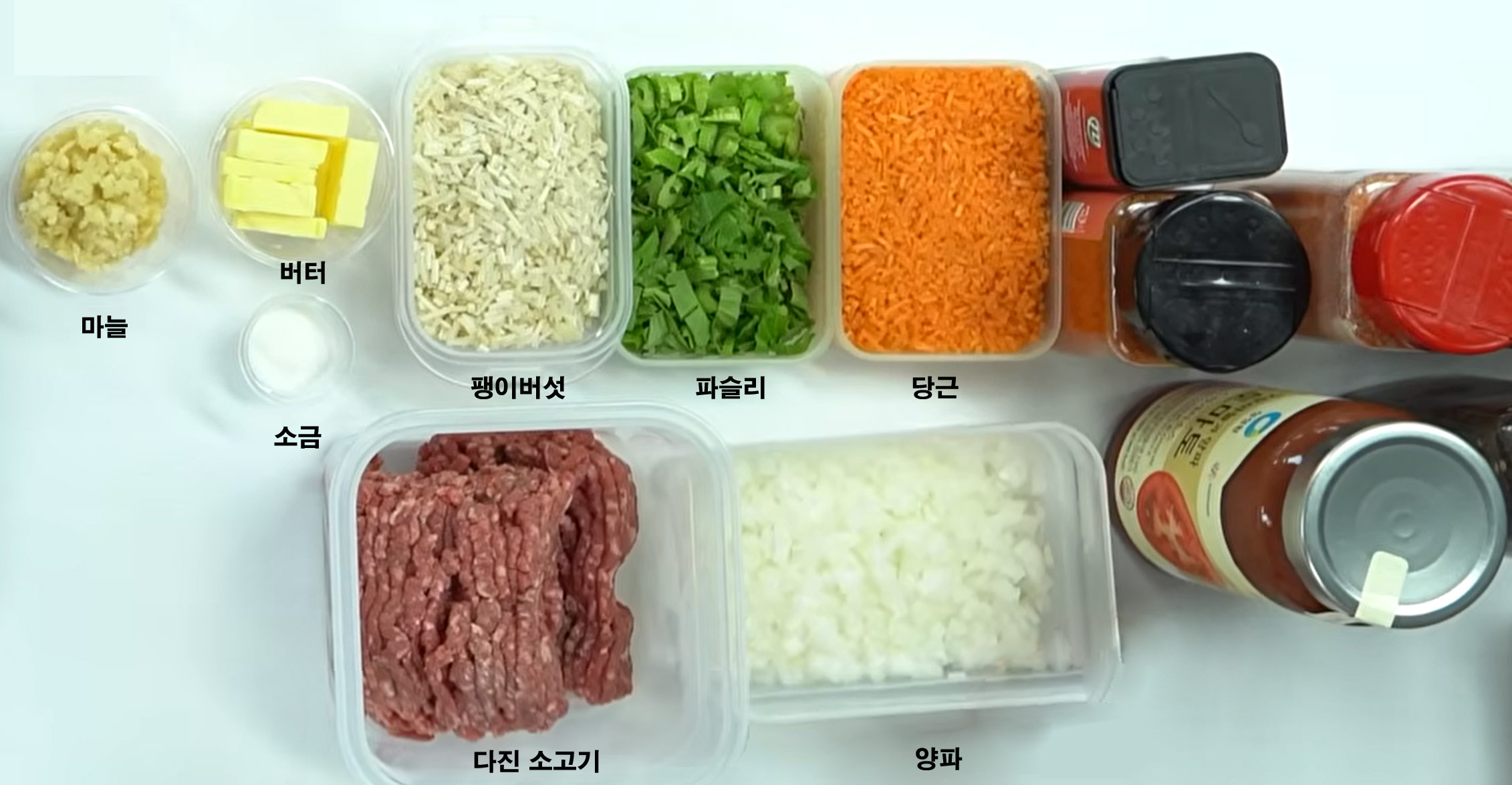 - 다진 양파(또는 적양파) 300g, 다진 마늘 60g, 다진 당근 150g