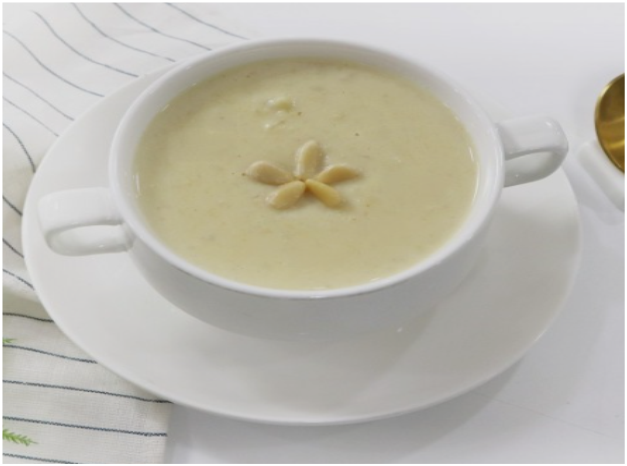 - 냄비에 체에 거른 수프국물을 넣고 중불에서 소금으로 간을 맞추고 달걀 노른자를 잘 풀어 조금씩 부어가며 잘 섞는다.