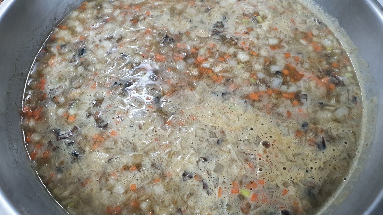 - 볶다가 쌀알이 투명해지면 준비한 다시마 육수 11컵을 넣어주고 위 2번에서 준비한 믹서기에 갈은 전복내장을 넣어준다.