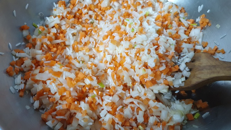 ※ 밥 대신 쌀을 이용할 때는 30분이상 불려야 하는데 이때 불려둔 쌀을 함께 볶는다. - 당근, 버섯, 전복살을 넣고 중불에서 1-2분 정도 볶다가 갈아 놓은 내장을 넣는다.