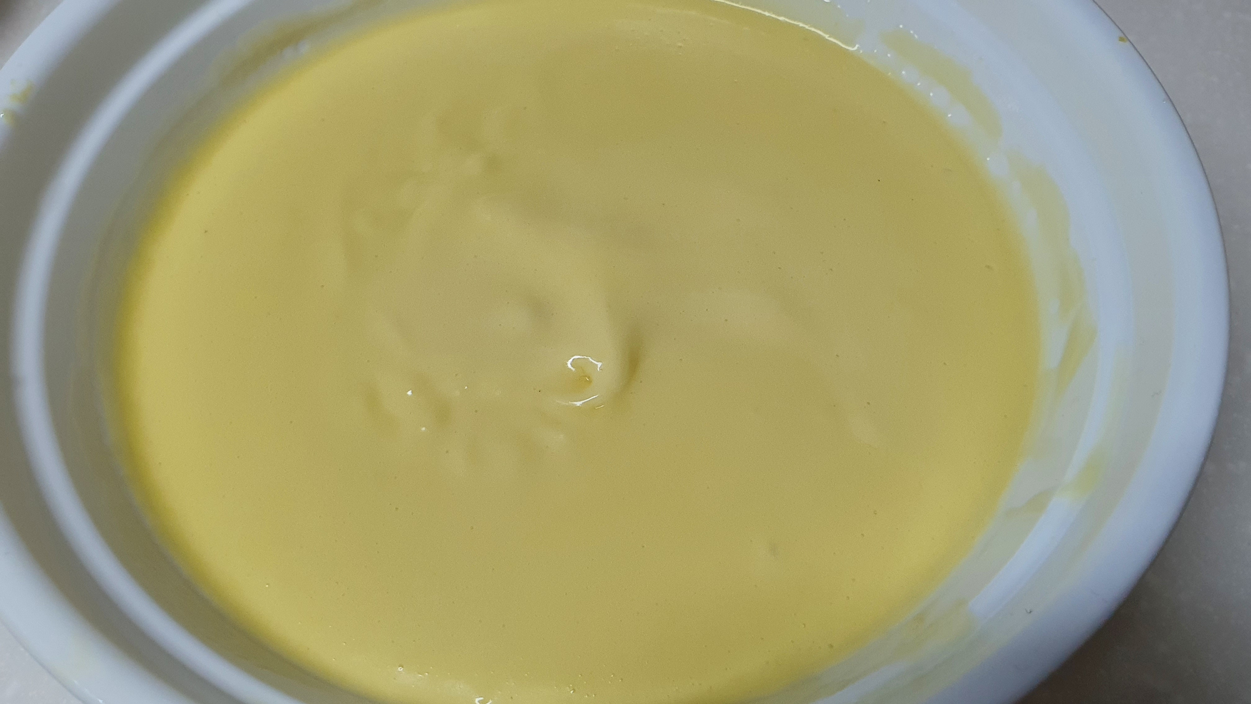 ㅇ 계속 저으면서 카놀라오일을 조금씩 넣기 → 색깔이 아이보리색으로 변하면서 걸쭉해지면 오일을 좀 더 많이 넣기