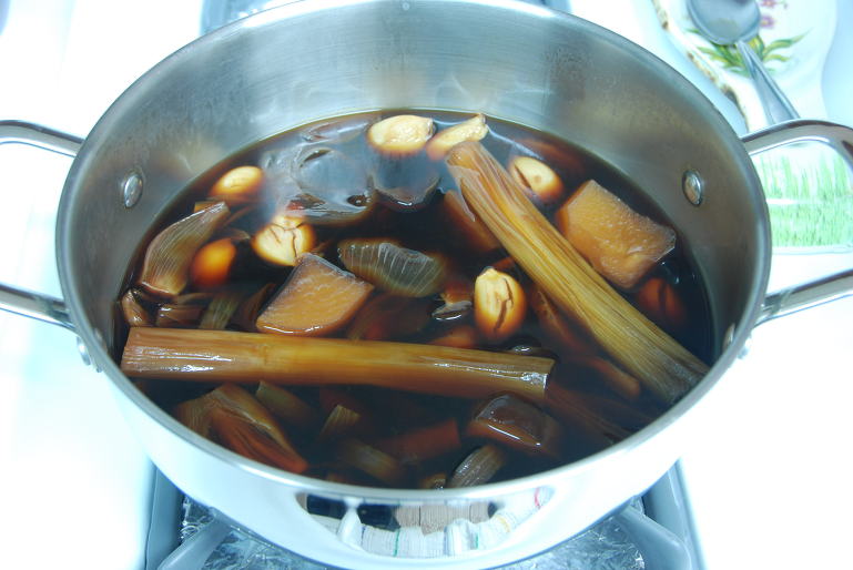 - 간장 3컵, 물 3/4컵, 레드와인 1/2컵에 사과 반개(2-3조각으로 자른다), 양파 한개, 파 한뿌리, 저민 생강 한톨, 통마늘 한 주먹을 넣어서 끓여 준다. 한소큼 끓어 오르면 불을 줄여서 약한 불로 한시간 정도 다려서 야채랑 과일이 물컹물컹 해질 때까지 끓이면 간장이 2/3로 줄어 든다.