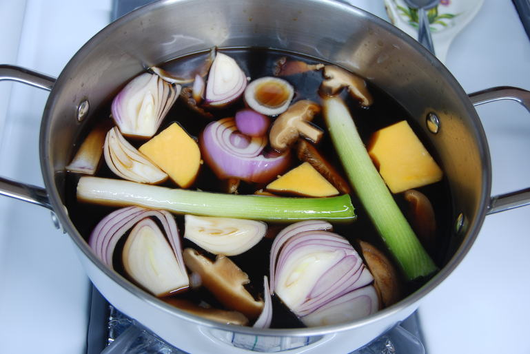 - 진간장에 맛술, 양파, 파, 생강, 마늘, 버섯을 넣고 센 불에 한번 끓인 후 약불로 줄여 1시간 정도 끓인다.
