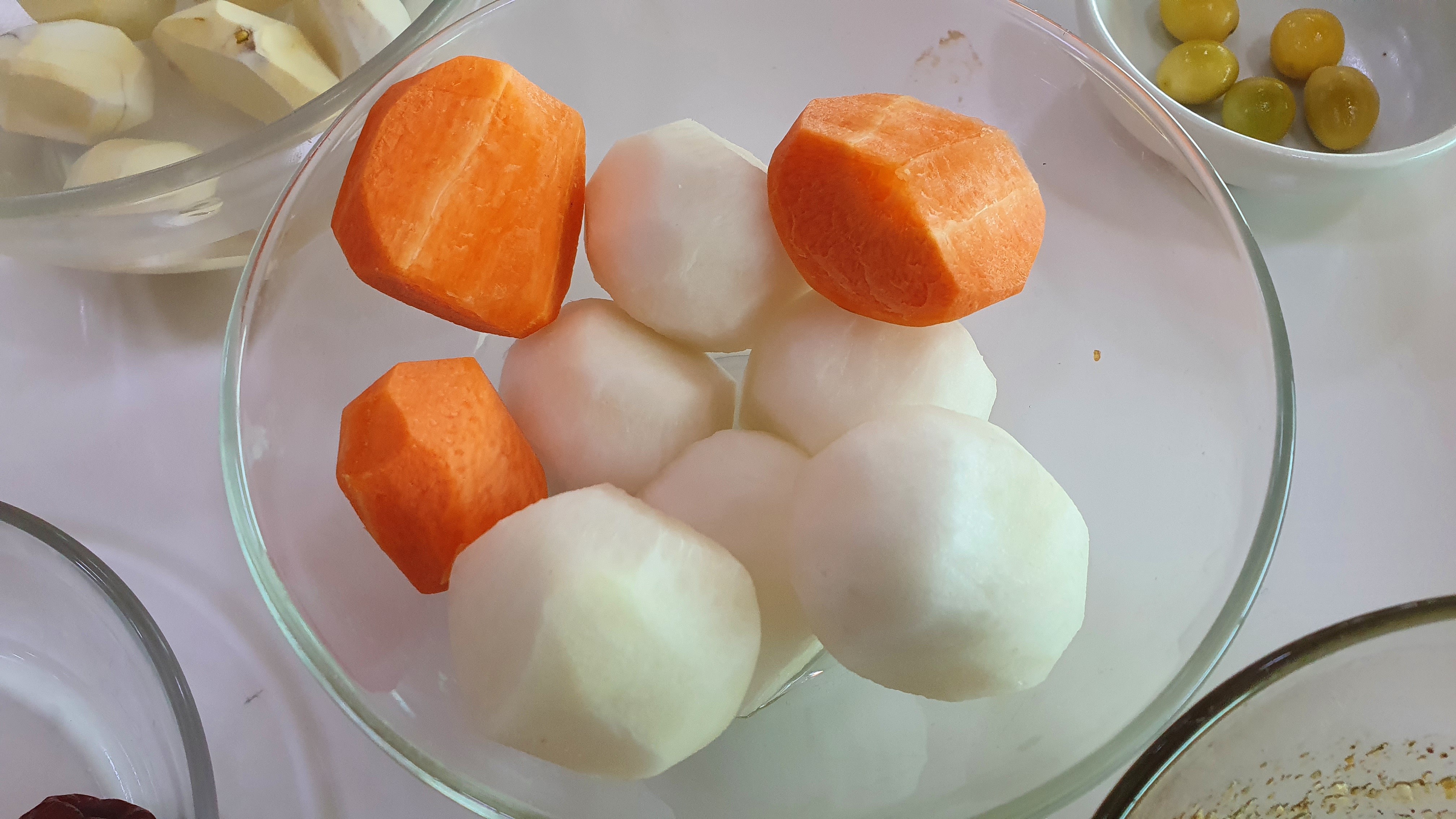 - 양파는 뿌리를 제거하고 1/4크기로 자르고 무는 1/8 정도 크기로 잘라 모서리를 정리한다.