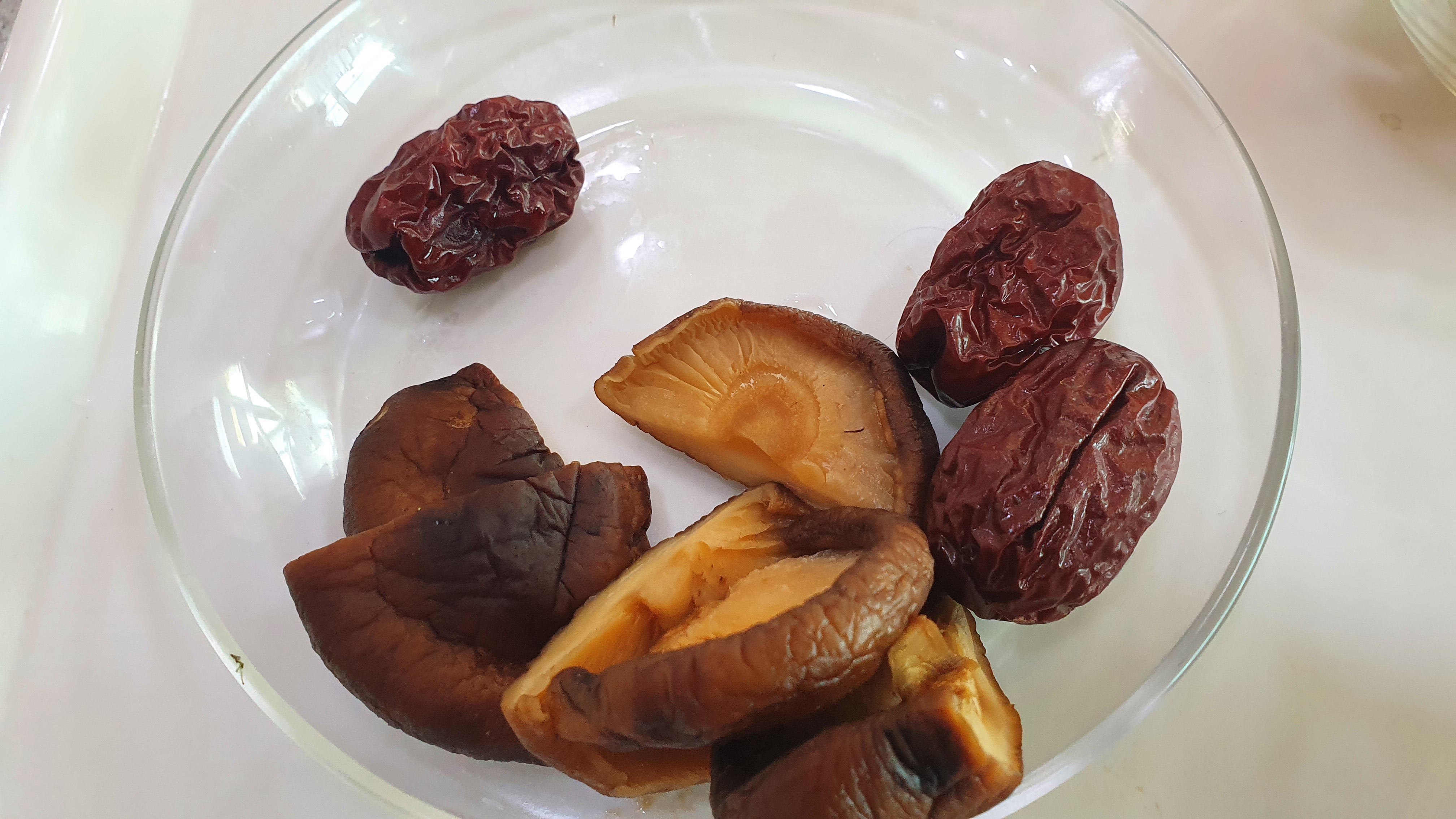 ※ 밤도 깎아 넣으면 좋음 - 표고 버섯은 밑둥 제거 후 4등분, 일부는 표고 머리에 십자 모양 칼집 내기