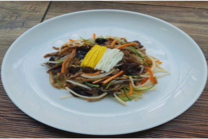 - 지단을 제외한 각각의 익힌 재료를 한데 섞어 깨소금과 참기름에 버무린 후 그릇에 담고 그 위에 지단을 올린다.