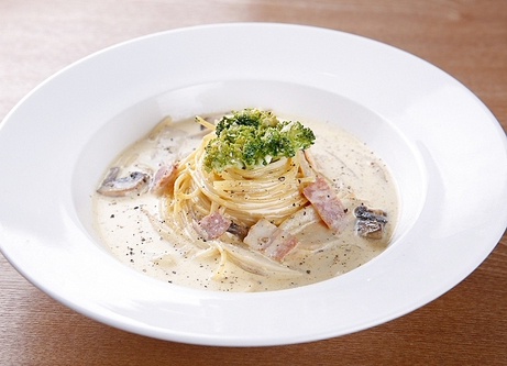- 스파게티면까지 넣을 수 있는 큰 냄비에 조리한 버섯과 베이컨을 함께 넣고 유지(크림)과 소금을 넣는다. 스프가 아닌 진한 소스를 만드는 것이므로 한동안 천천히 끓여서 국물을 줄여 진하게 만들어야 한다. (급하면 냉수에 녹인 옥수수 가루를 첨가한다)