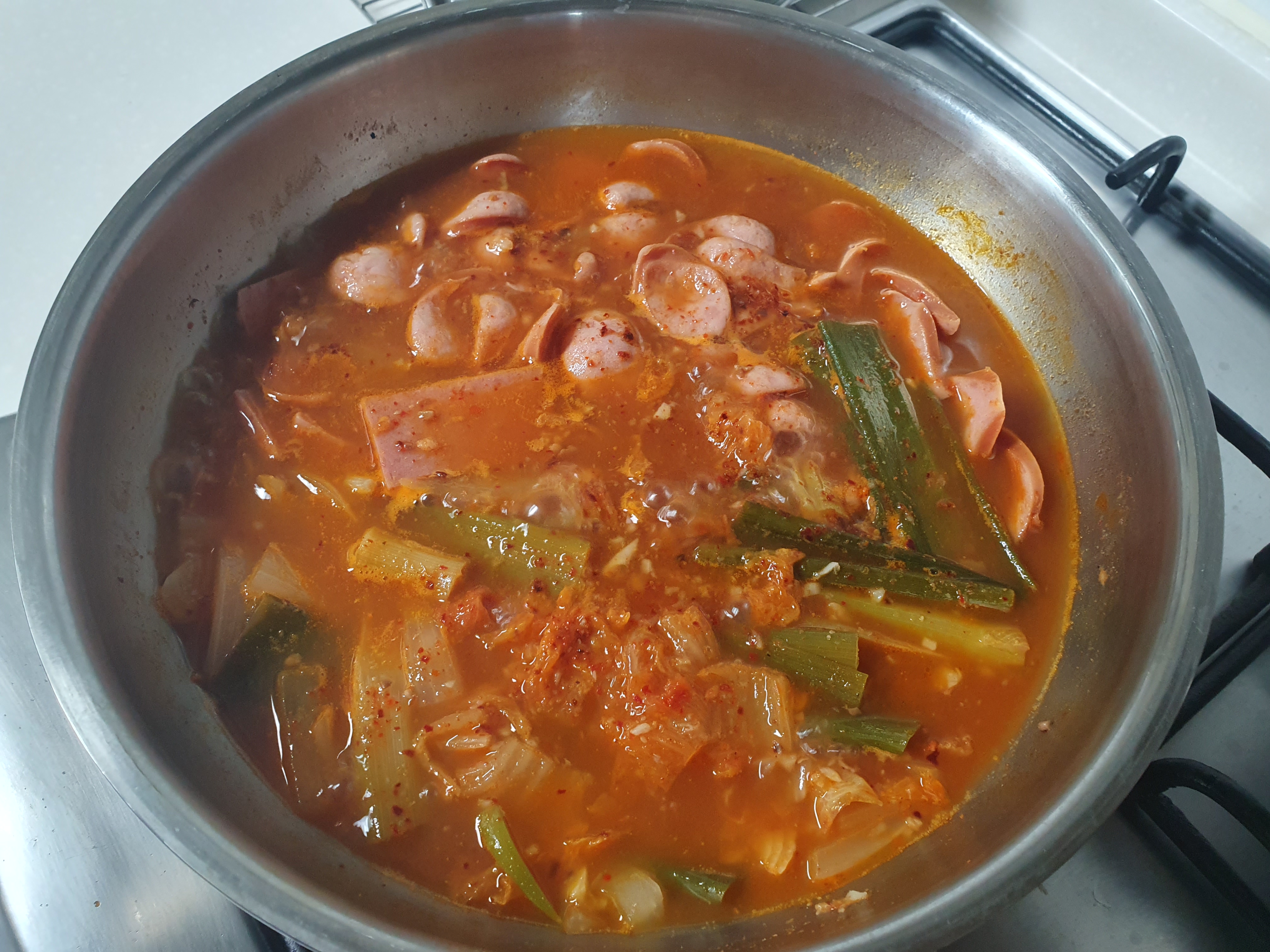 - 전골 냄비에 대파를 깔아놓은 후 양파, 소시지, 통조림 햄, 베이크드빈스, 신김치, 양념장재료, 정수물을 넣고 강 불에 올린다.