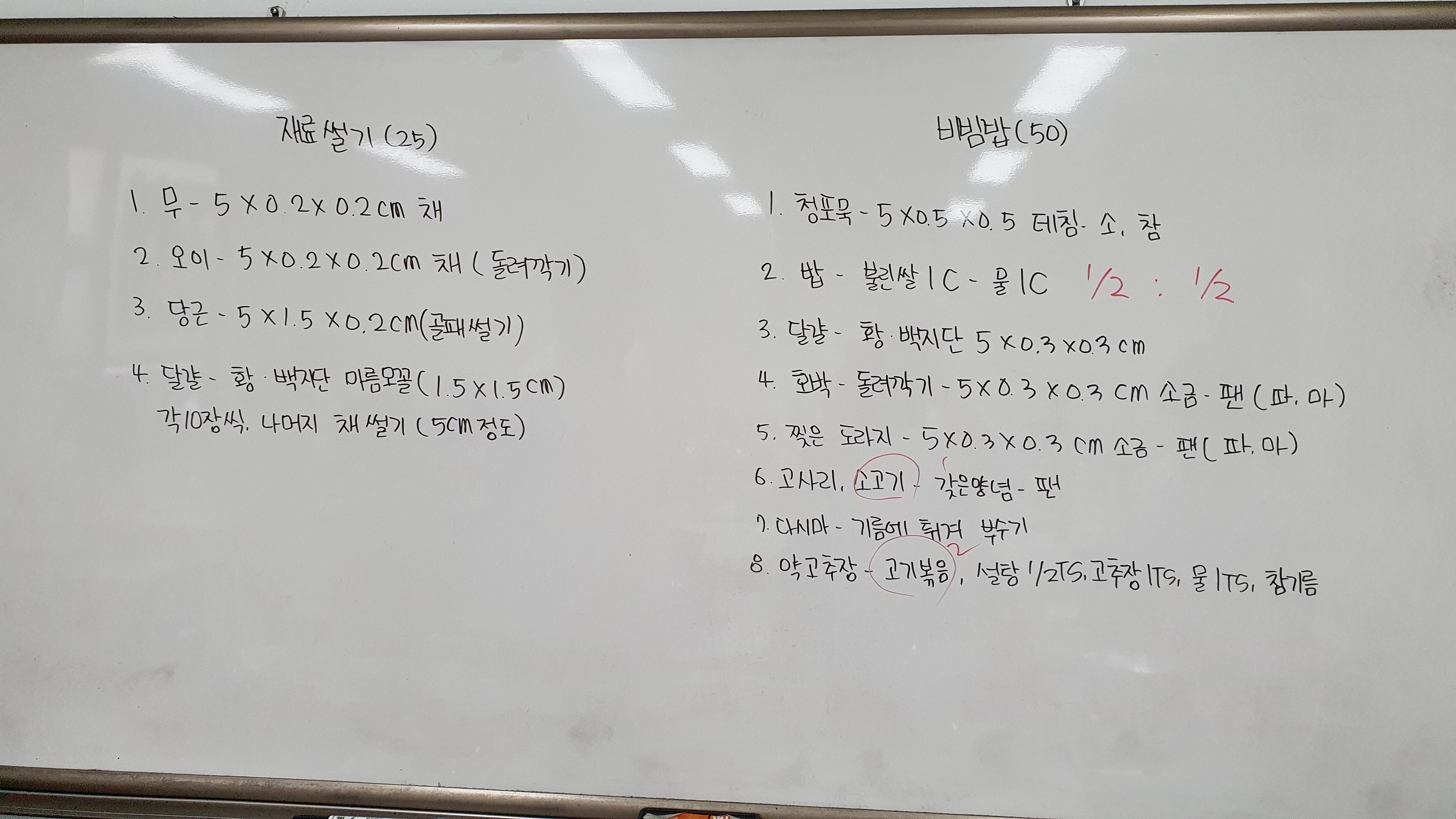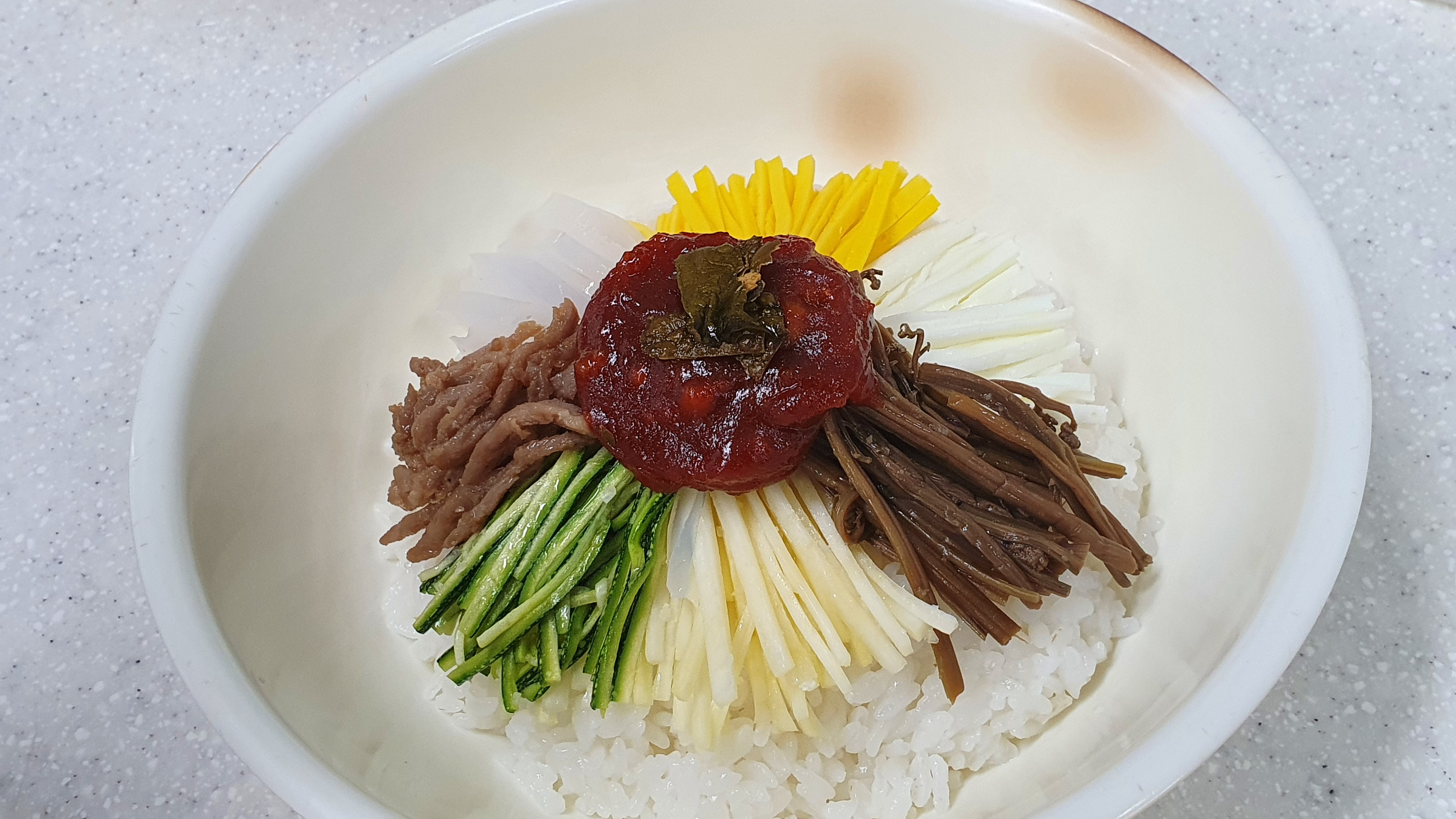 - 황백지단 : 팬 코팅 → 불끄고 → 노른자 → 흰자 → 약불 → 키친타올로 눌러주기 → 키친타올에 올리기 → 5x0.3x0.3cm(약고추장 끓는 동안 칼에 물 뭍혀서 칼 뒷끝으로 찍어 썰기)