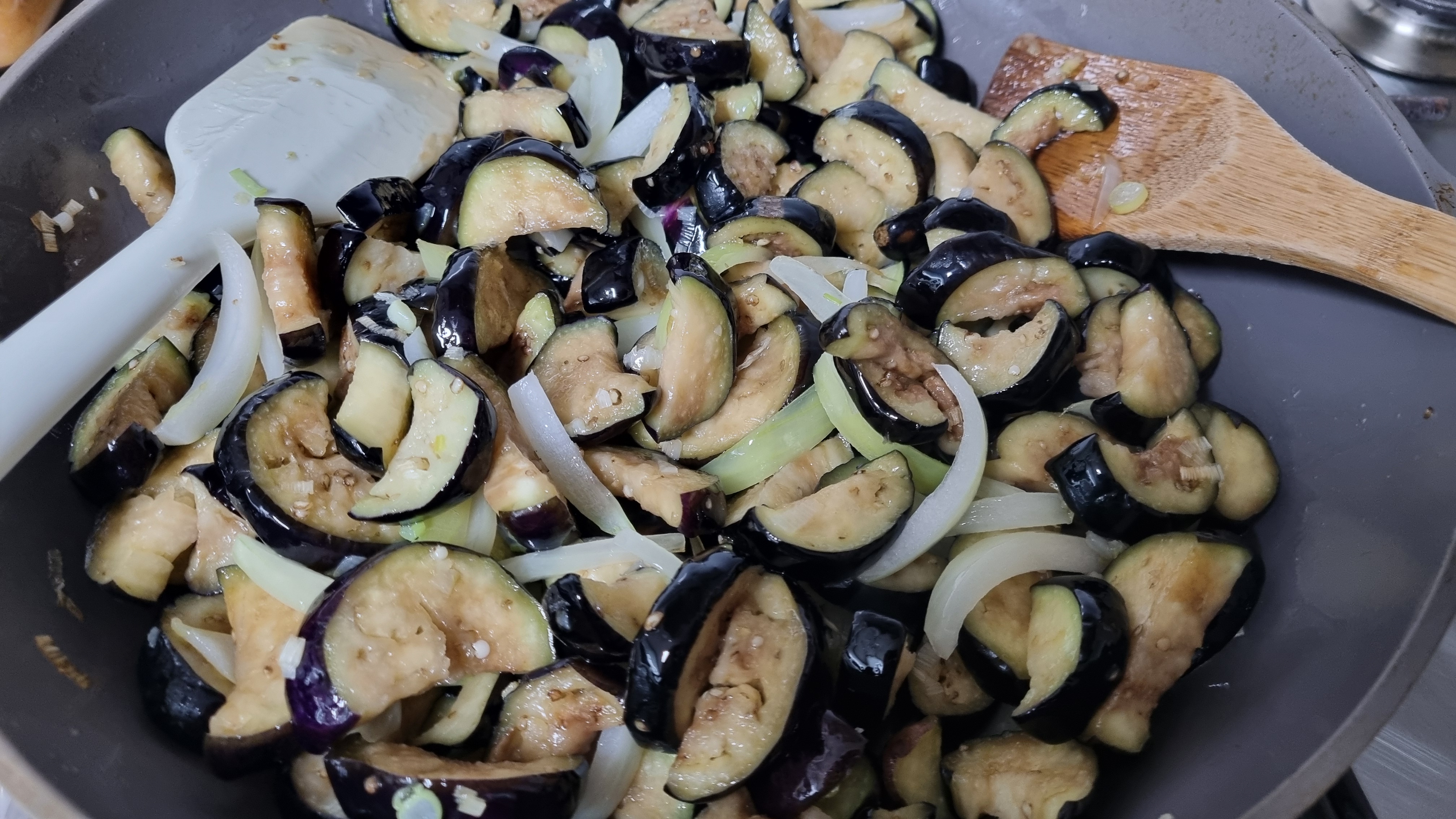 - 가지가 반쯤 익으면 야채를 넣고 볶은 후 참기름과 통깨를 넣고 마무리한다.