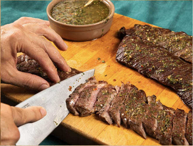 - 스테이크를 결 방향으로 5~6인치(12~15cm) 크기로 자른 다음, 결 반대 방향으로 얇게 썰어 위에 치미추리 소스(Chimichurri sauce)를 얹어 제공한다.