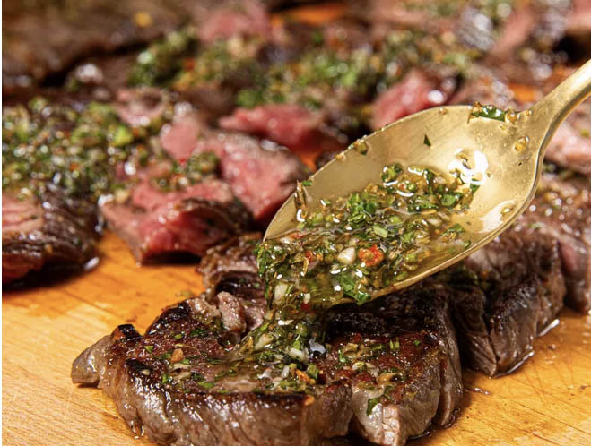- 스테이크가 다 익기 직전에 강렬한 허브와 마늘 풍미를 주는 치미추리 소스를 살짝 바른다. 너무 일찍 바르면 소스가 타버리기 때문이다. 나머지 소스는 얇게 썬 스테이크와 함께 서빙해서 테이블에서 위에 얹어 먹는다.