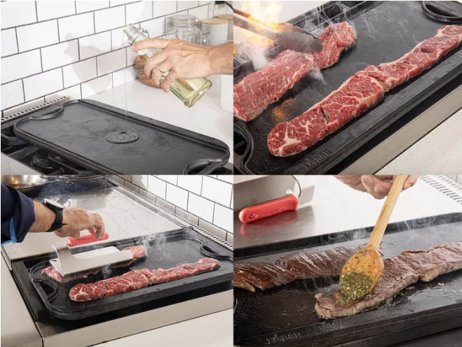 - 불은 강불로 구워야 하며, 스커트 스테이크는 얇기 때문에 굽는 동안 너무 익을 위험이 있으므로 자주 돌려주어야 한다.