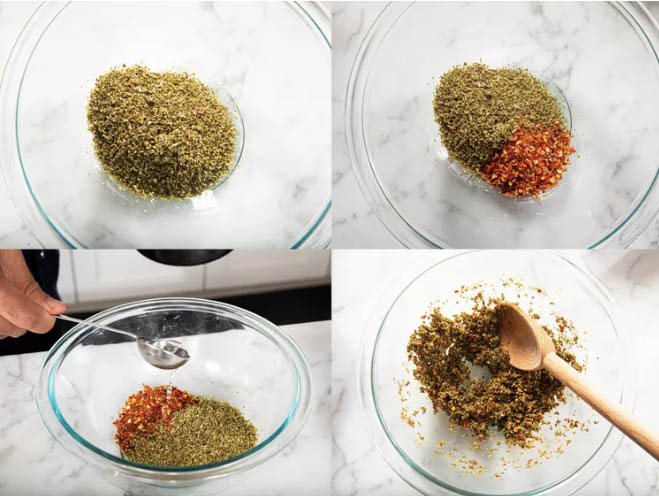 - 중간 크기의 그릇에 말린 오레가노와 칠리(홍고추) 플레이크를 섞고 끓는 물 2큰술을 넣고 저어서 섞는다.